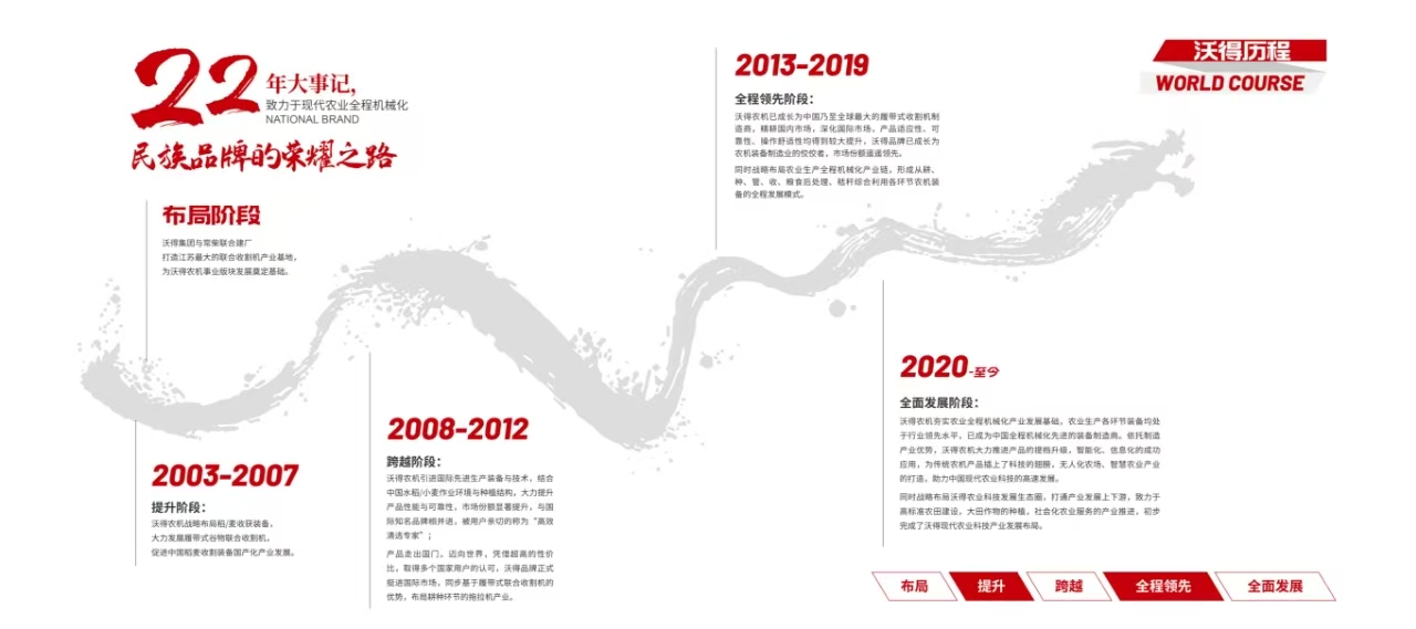 沃得農(nóng)機(jī)隸屬于中國(guó)民營(yíng)企業(yè)500強(qiáng)之一的江蘇沃得集團(tuán),占地面積3000余畝,員工8000余人,2016年實(shí)現(xiàn)銷(xiāo)售70億元人民幣,是一家集研發(fā)、生產(chǎn)、銷(xiāo)售、服務(wù)于一體的大型現(xiàn)代化農(nóng)機(jī)裝備制造企業(yè)。沃得農(nóng)機(jī)立足水田,致力于現(xiàn)代農(nóng)業(yè)全程機(jī)械化,歷經(jīng)近30年發(fā)展,產(chǎn)品形成以耕-種-田間管理-收獲-秸稈綜合利用-糧食后處理全系列產(chǎn)品線。依托優(yōu)質(zhì)的產(chǎn)品和誠(chéng)信的服務(wù),公司產(chǎn)品暢銷(xiāo)全國(guó)28個(gè)省市自治區(qū),出口至世界38個(gè)國(guó)家和地區(qū)。